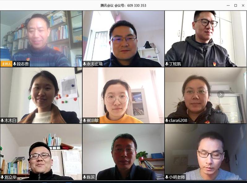 活动当天,教工一支部书记段志贵、教工二支部书记孙映成、员工一支部临时负责人卞玉洁及员工二支部书记崔冶敏分别带领各支部党员共同学习了《中共教育部党组关于教育系统学习贯彻习近平总书记在“不忘初心、牢记使命”主题教育总结大会上的重要讲话的通知》精神,以及《关于贯彻落实<2019-2023年全国党员教育培训工作规划>实施细则》《党委(党组)全面从严治党主体责任规定》的相关内容。各党支部书记公开近期党务工作,特别对广大师生党员在居家抗疫期间,积极响应党中央对广大党员的号召,积极捐款真诚奉献爱心,用实际行动支持新冠肺炎疫情防控工作,并在完成教学、科研、管理、学习等任务的同时,坚持每天登陆学习强国平台进行自主学习,总支总体排名位列公司前列等,进行了充分肯定。师生党员在线上进行热烈交流,党员代表结合活动主题进行发言。教工二支部还为本月入党的顾正兰同志过了政治生日。