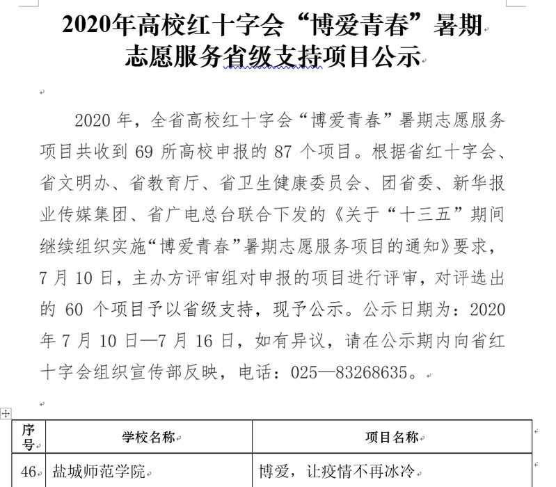 根据省红十字会、省文明办、省教育厅、省卫生健康委员会、团省委、新华报业传媒集团、省广电总台联合下发的《关于“十三五”期间继续组织实施“博爱青春”暑期志愿服务项目的通知》要求,评审组对全省69所高校红十字会报送的87个项目进行了评审,共评出60个省级支持项目。