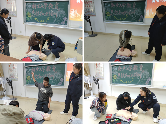 在急救技能实践环节,同学们了解了如何使用自动体外除颤仪(AED)的实际操作练习。通过判断患者意识、呼叫紧急救援、胸外人工按压、自动体外除颤等步骤的实践练习,同学们体验了突发事件场景下的急救技巧的使用,巩固了在讲座中掌握的理论知识,提升了培训的参与感。