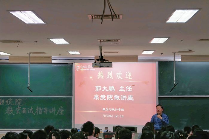 首先,郭大鹏主任围绕教资面试的备考要点,深入浅出地进行讲解。他强调,备课要讲求效率,需要看透教学内容,做好教学设计,规划好板书布局,以确保课堂高效有序开展。在谈及上课时,郭主任提出了“讲格局”的理念。他指出,教师应接近“三体”——尊重员工的主体地位,面向全体员工,同时关注个体差异,通过“三会”形成素养,此外,郭主任还详细阐述了教学中应夯实 “四基”、“四能”,他鼓励在座的师范生们在未来的教学中发展这些核心素养,以提高教学质量和效果。