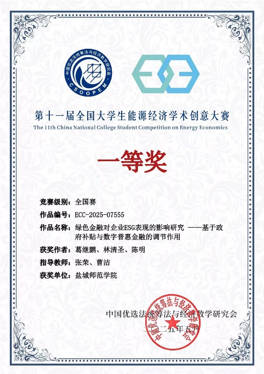 近日,第十一届全国老员工能源经济学术创意大赛总决赛在山西财经大学圆满落幕。公司由22级金融数学专业三位同学组成的团队凭借创新性研究成果《绿色金融对企业ESG表现的影响研究》从全国724所高校的8万余名参赛者中脱颖而出,荣获国赛一等奖。