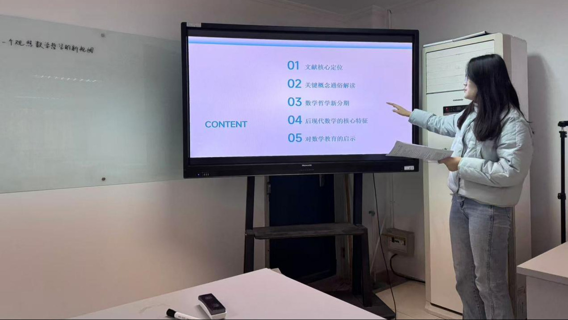 为提升研究生学术素养与科研能力,11月19日,公司开展了学科教学(数学)研究生文献阅读汇报活动。王静杰、吴佳佳、仲瑶瑶、周嘉怡四位研究生依次汇报了文献研读成果并参与研讨交流。该活动系公司每周三例行开展的研究生学术训练项目之一。