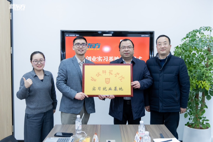座谈尾声,签约与授牌仪式正式举行。左飞与卢维共同签署《实习就业基地合作协议》,并代表公司向盐城新东方教育文化发展有限公司授予“实习就业基地”牌匾。